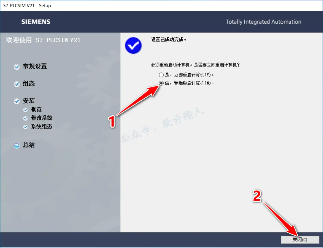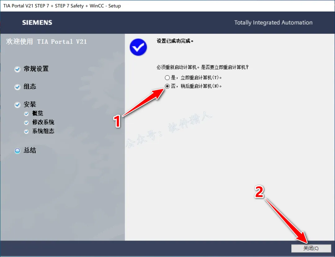18.选择【否,稍后重启计算机】,点击【关闭】。