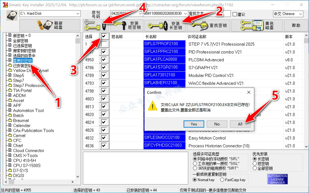 53.安装密钥:①点击【需要的密钥】;②点击【安装长密钥】;③在“选择”后打勾;④点击“选择”上方的安装按钮;⑤点击【All】。