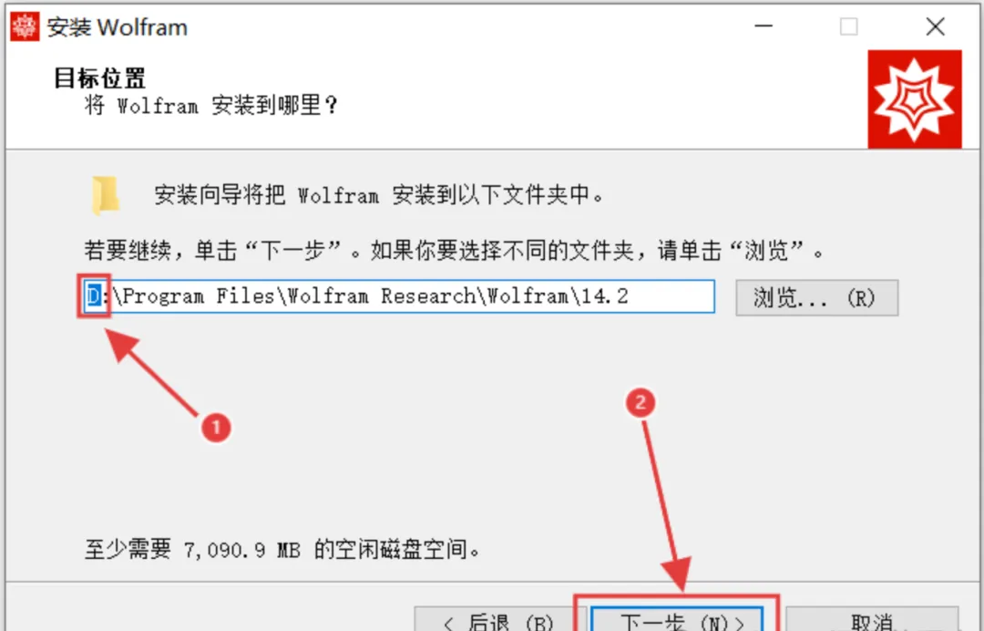 7.修改Mathematica安装路径:可以把地址栏中的首字母C改成D,则代表程序将安装到电脑D盘,选择好点击【下一步】。(注意!安装路径和文件夹不能出现中文,否则安装过程可能不正常)