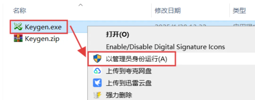 18.选中解压出来的【Keygen】程序,鼠标右键选择【以管理员身份运行】。