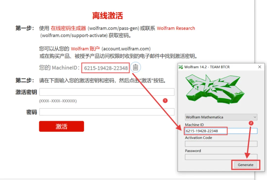 20.切换回到15步骤打开的页面,复制【您的MachineID】后面的一串数字,可以直接点击数字后面的复制图标进行复制,然后【粘贴】到激活工具【MachineID】下面的框内,最后点击【Generate】。