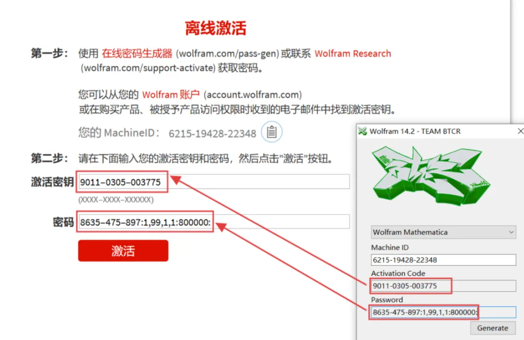 21.把激活工具生成的密钥和密码,分别复制到【激活密钥】和【密码】后面的输入框。