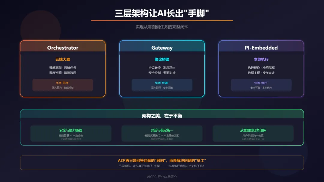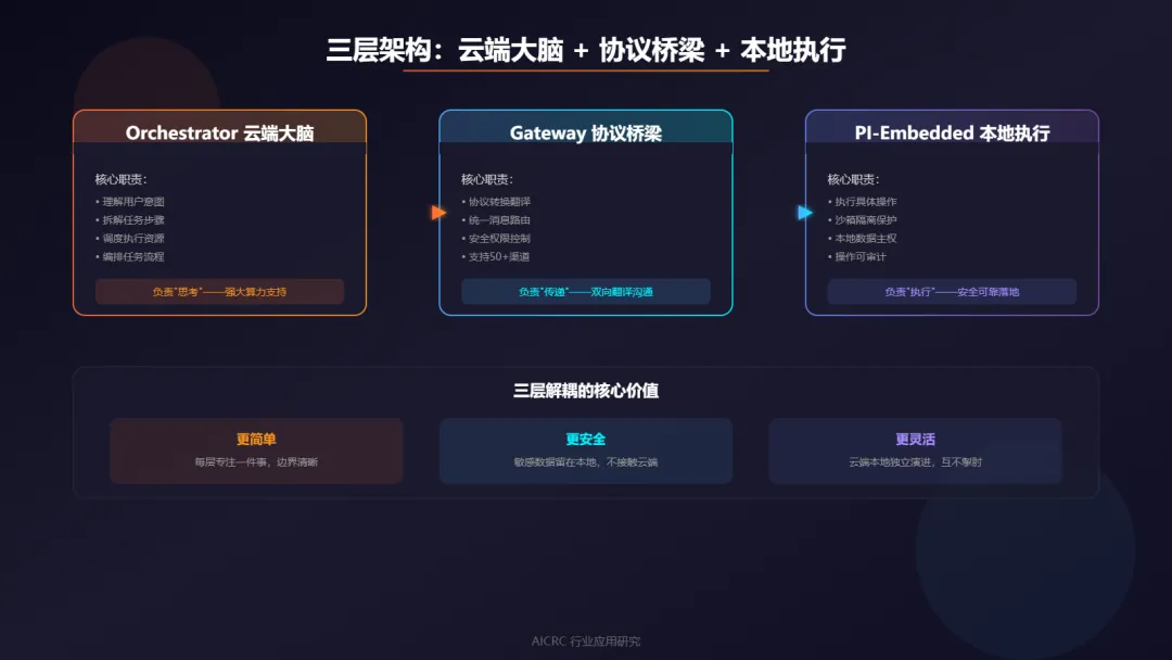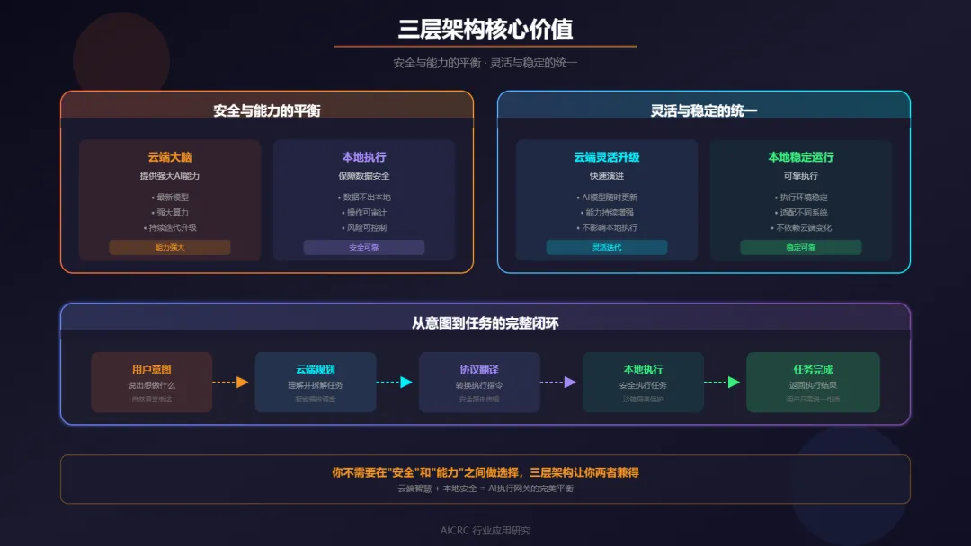 这就是三层架构的本质:云端大脑负责"想",本地执行负责"做",协议桥梁负责"传"。