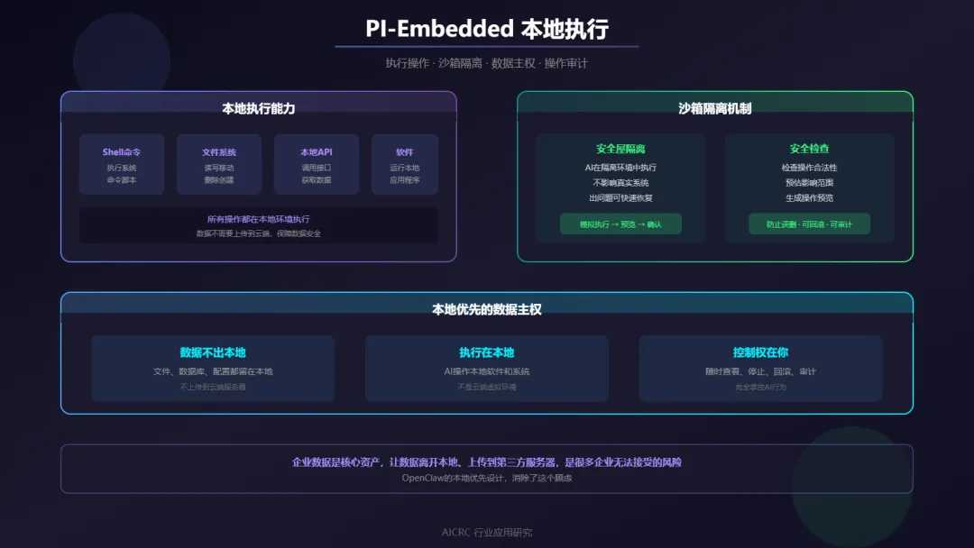 AI的"执行"——操作文件、调用API、运行软件——这些涉及真实数据和系统的操作,放在本地。