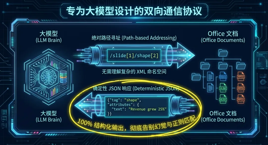 一套专为大模型设计的双向通信协议,从根本上弥合了 LLM 大脑与物理文件结构之间的鸿沟。系统果断抛弃了复杂的 XML 命名空间,转而采用类似 POSIX 目录的绝对路径寻址(Path-based Addressing)机制定位任意文档节点。所有查询与变更操作均被强制收束于确定性 JSON 响应(Deterministic JSON)的框架内,这种 100% 的结构化输出彻底终结了模型幻觉与脆弱的正则匹配,为智能体构建了严密的强类型反馈闭环。