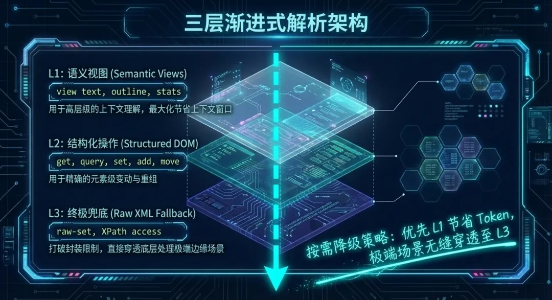 面对庞杂的文档数据,信息提取被拆解为极具策略性的三层渐进式解析架构。表层的 L1 语义视图以最小的 Token 开销喂给模型高度凝练的文本与大纲上下文;当需要精确重组时,系统下潜至 L2 结构化 DOM 层执行基于选择器的原子级变动。一旦遭遇极端边缘场景,按需降级策略会瞬间击穿封装,无缝穿透至 L3 终极兜底层,赋予开发者直接通过 XPath 操作底层 Raw XML 的最高权限。