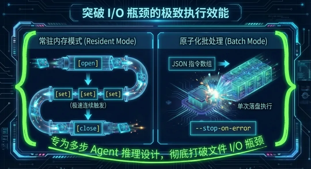 传统的文件 I/O 瓶颈被专为多步 Agent 推理设计的极速执行引擎彻底粉碎。常驻内存模式(Resident Mode)利用命名管道技术,将文档对象稳稳锁定在内存态,实现极速连续触发下的近乎零延迟读写。而针对高密度的批量修改,原子化批处理(Batch Mode)允许系统一次性吞吐庞大的 JSON 指令数组,通过严格的终止机制确保事务的完整性,并在单次落盘执行中榨干极致效能。