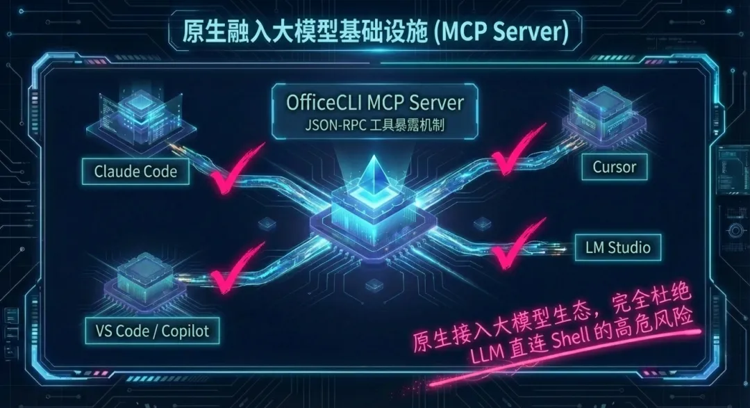 原生融入大模型基础设施的 OfficeCLI MCP Server,通过标准的 JSON-RPC 工具暴露机制,完成了对前沿 AI 生态的无缝接入。无需任何中间件,系统即可直接作为能力插件挂载至 Claude Code、Cursor、VS Code Copilot 以及 LM Studio 等主流环境中。这种沙盒化的架构设计,不仅消除了繁琐的环境配置,更从底层完全杜绝了 LLM 直连宿主机 Shell 所带来的高危越权风险。