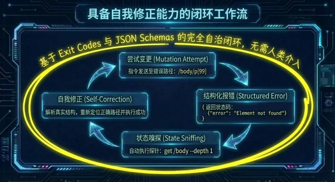 基于严格的 Exit Codes 与 JSON Schemas 标准,系统孕育出了一套具备完美自我修正能力的闭环工作流。当大模型发送变更指令至错误的虚拟路径时,系统不会静默崩溃,而是抛出带有明确状态码的结构化报错。敏锐的智能体会立刻捕获该异常,自动向下发起深度探测针解析真实目录结构,继而重新定位正确路径并再次执行,整个自愈过程在毫秒间完成,彻底告别人类干预。
