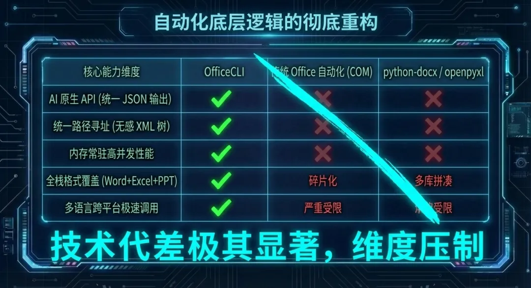 所有试图在真实商业环境中落地的 AI 智能体,最终都会被专有 Office 格式的封闭高墙无情拦截。直到 OfficeCLI 横空出世!这款基于 C# 构筑的纯粹单文件 CLI 引擎,赋予了 AI 代理直接从终端底层原生读写与全维接管 Word、Excel 及 PowerPoint 文件的降维打击能力。凭空生成电子表格、重组商业合同逻辑、瞬间榨取路演 PPT 的核心数据——完成这一切硬核操作,宿主机上根本不需要安装任何臃肿的 Microsoft Office 套件!