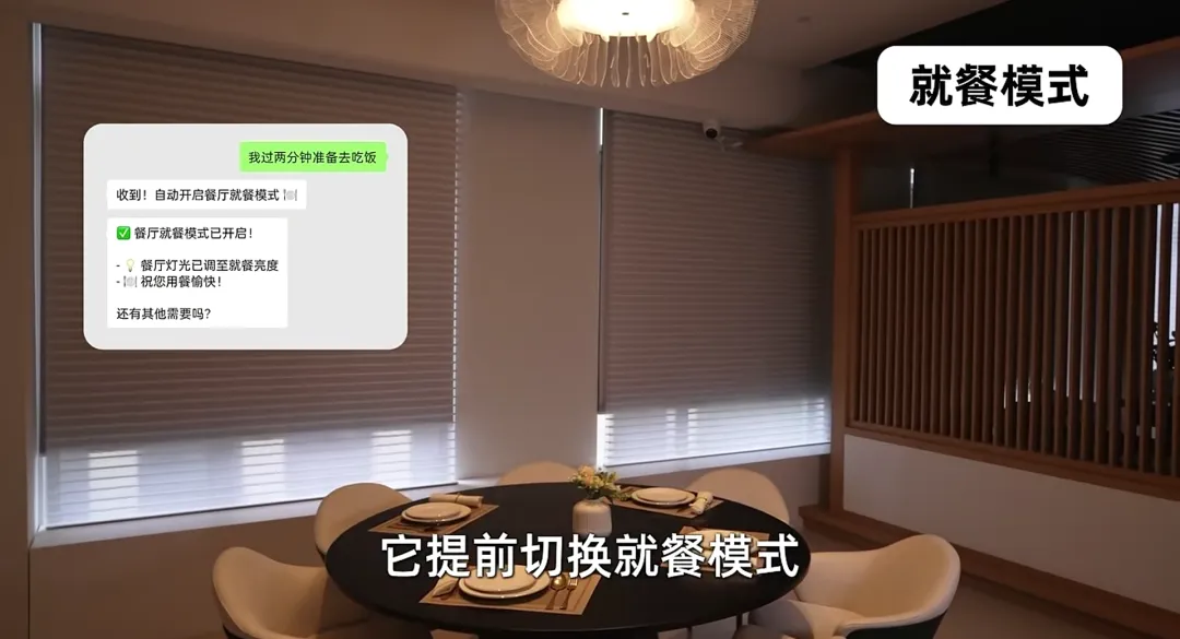 ,餐厅灯光调至暖黄,窗帘闭合,空调预冷。