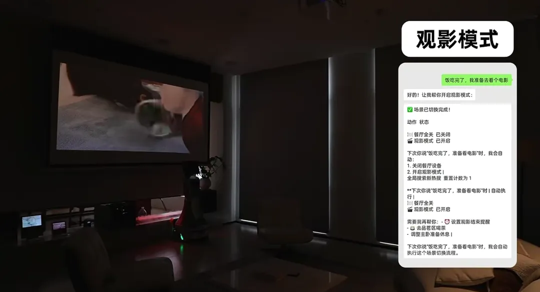 只要说一句“我吃好饭了,准备看个电影”,就自动开启了观影模式:餐厅灯光自动关闭,投影仪同步开启,观影模式无缝接管。