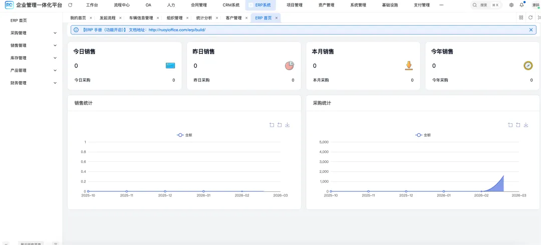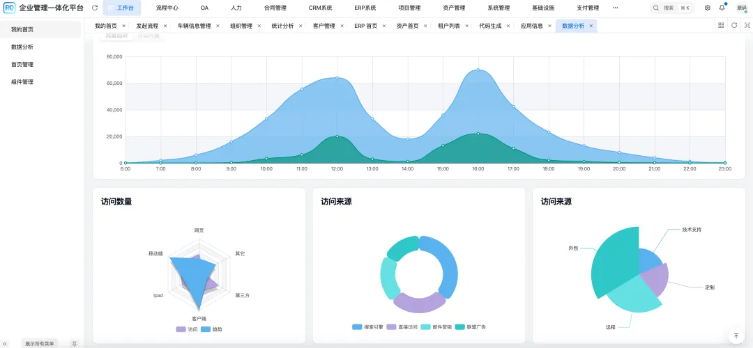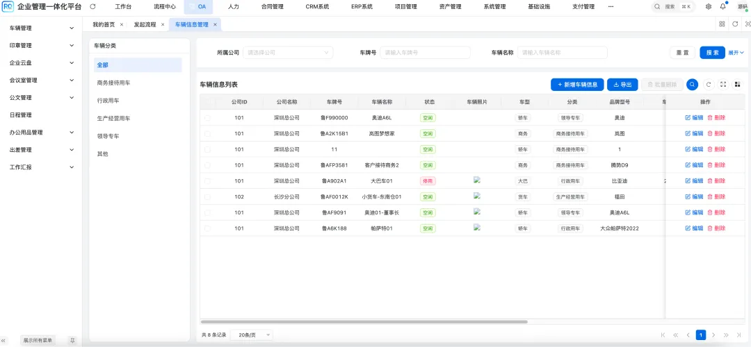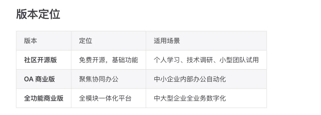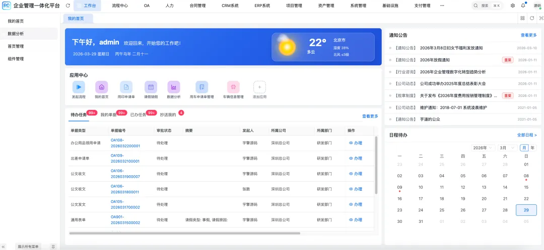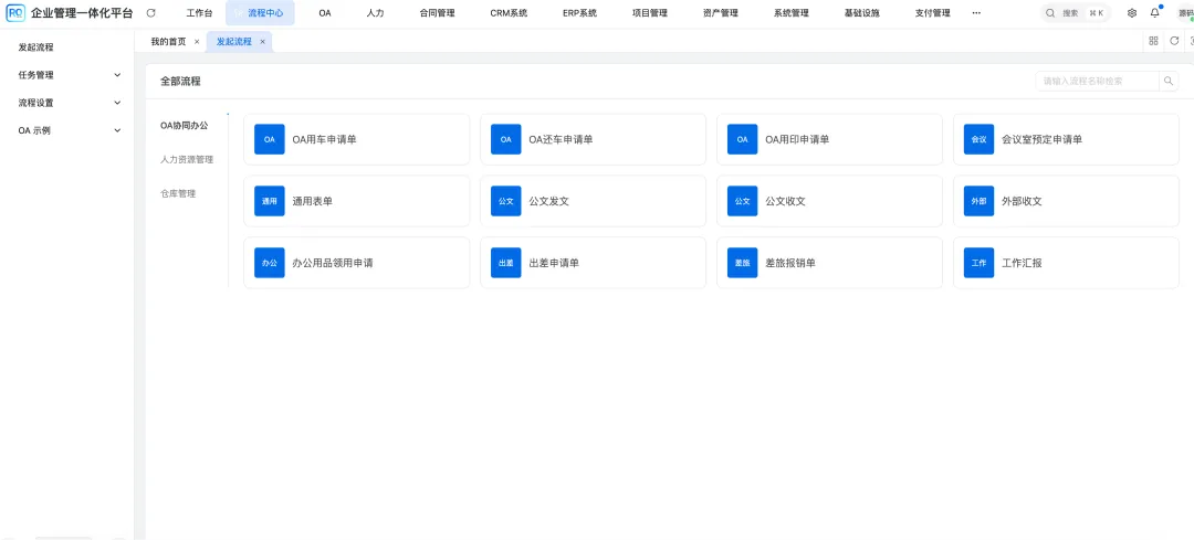 包括OA协同办公、HRM人力资源管理、CRM客户关系管理、SYS系统管理等基础模块,正在积极扩展ERP、EAM设备资产、MES等各业务模块,励志打通中小企业全场景业务。