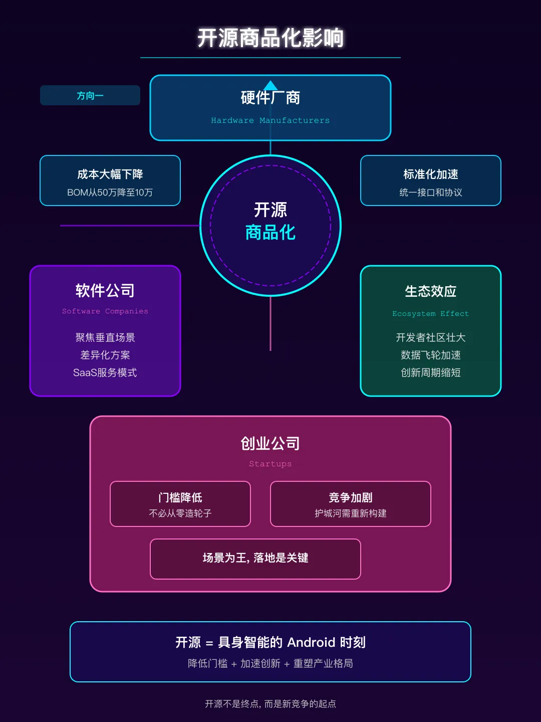 但 Android 类比也有局限性。手机 App 出 bug 最多闪退,机器人"出 bug"可能砸伤人。物理世界的容错空间远小于数字世界,这是具身智能开源必须额外解决的问题。