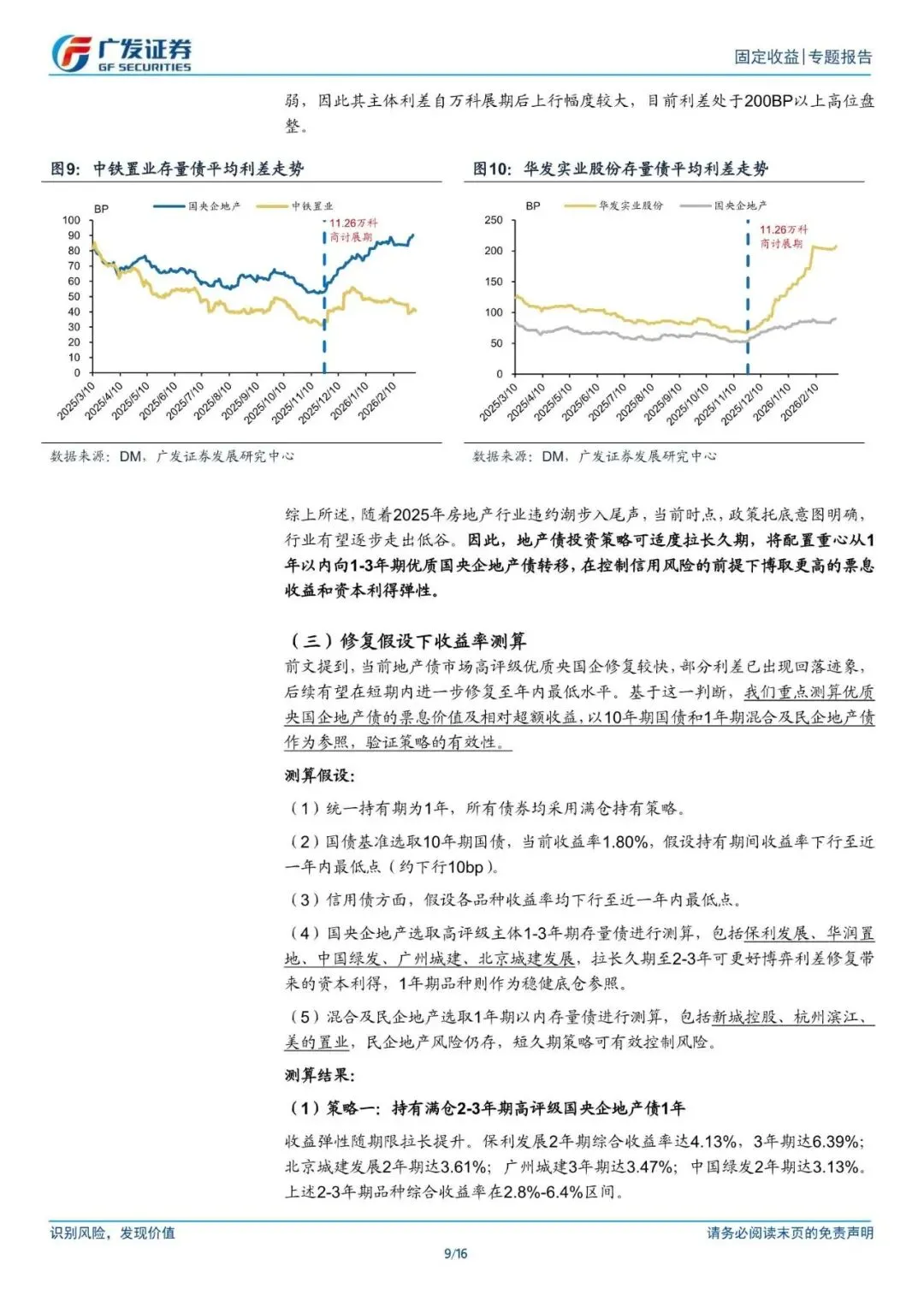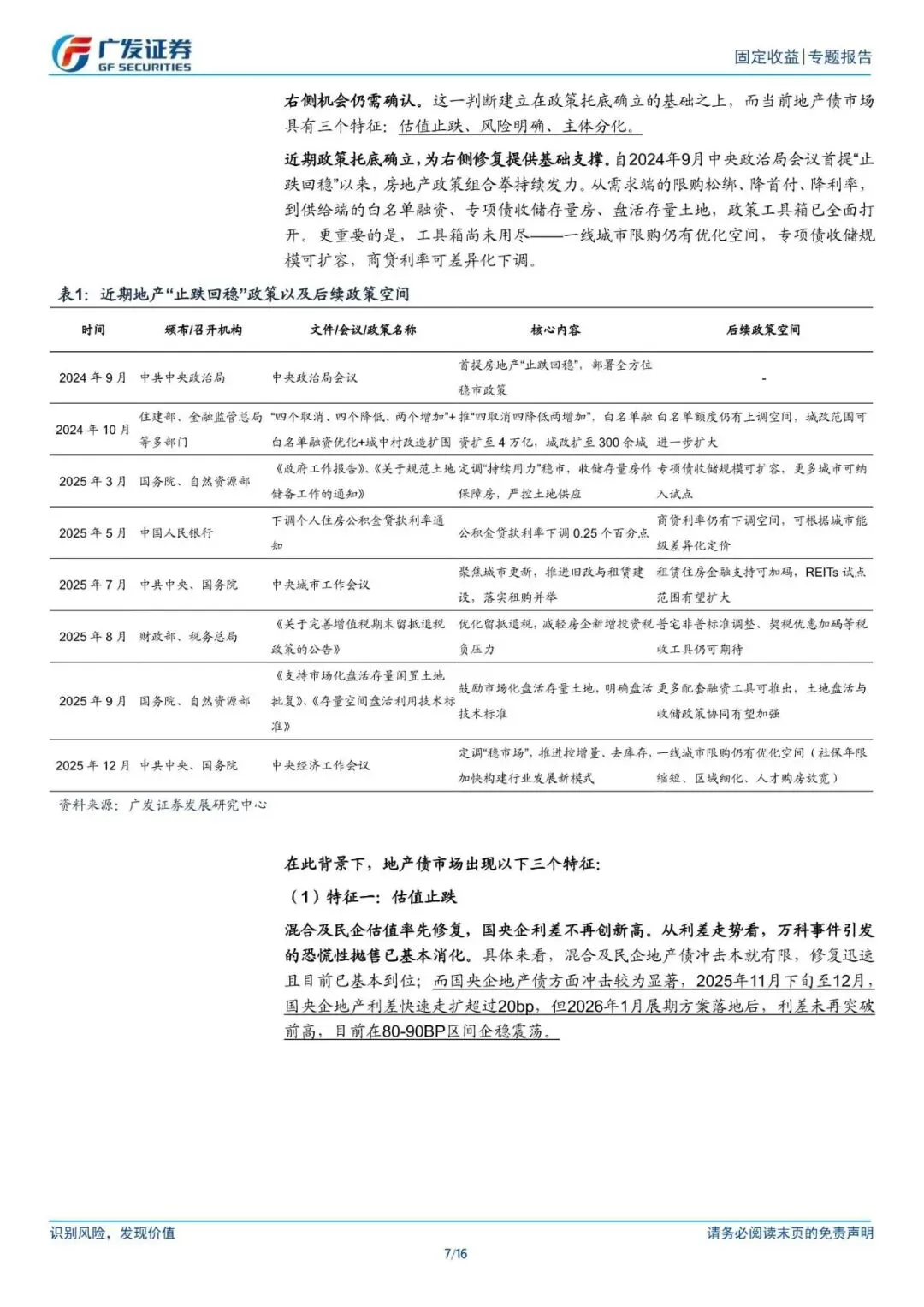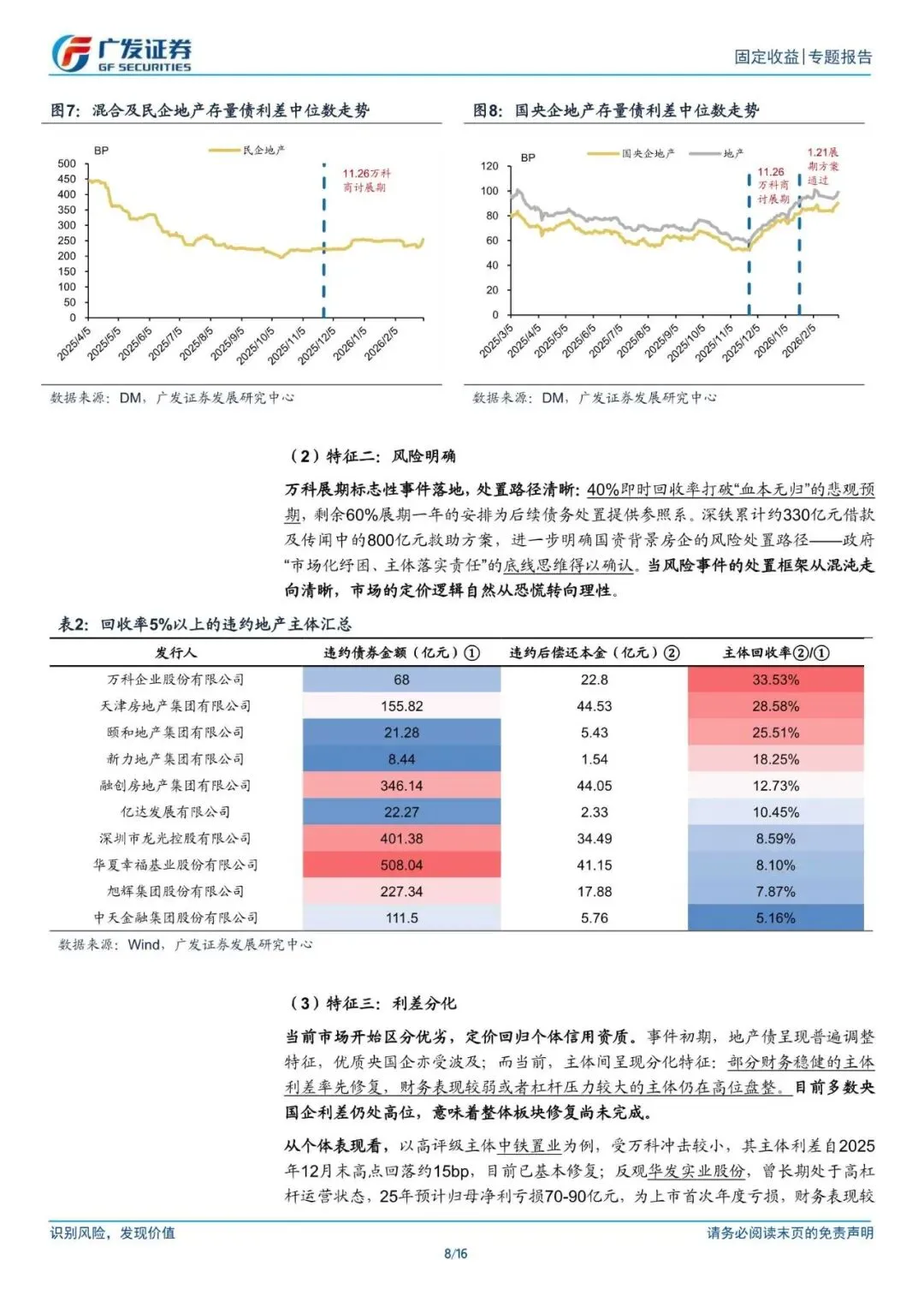 地产债目前出现三个特征。特征一:估值止跌。混合及民企利差率先修复、国央企利差不再创新高;特征二:风险明确。万科展期方案落地、40%回收率打破“血本无归”预期;特征三:利差分化。多数国央企主体仍在高位盘整,部分高评级主体率先修复,预计高评级主体修复速度较快。