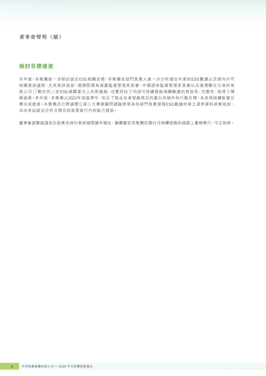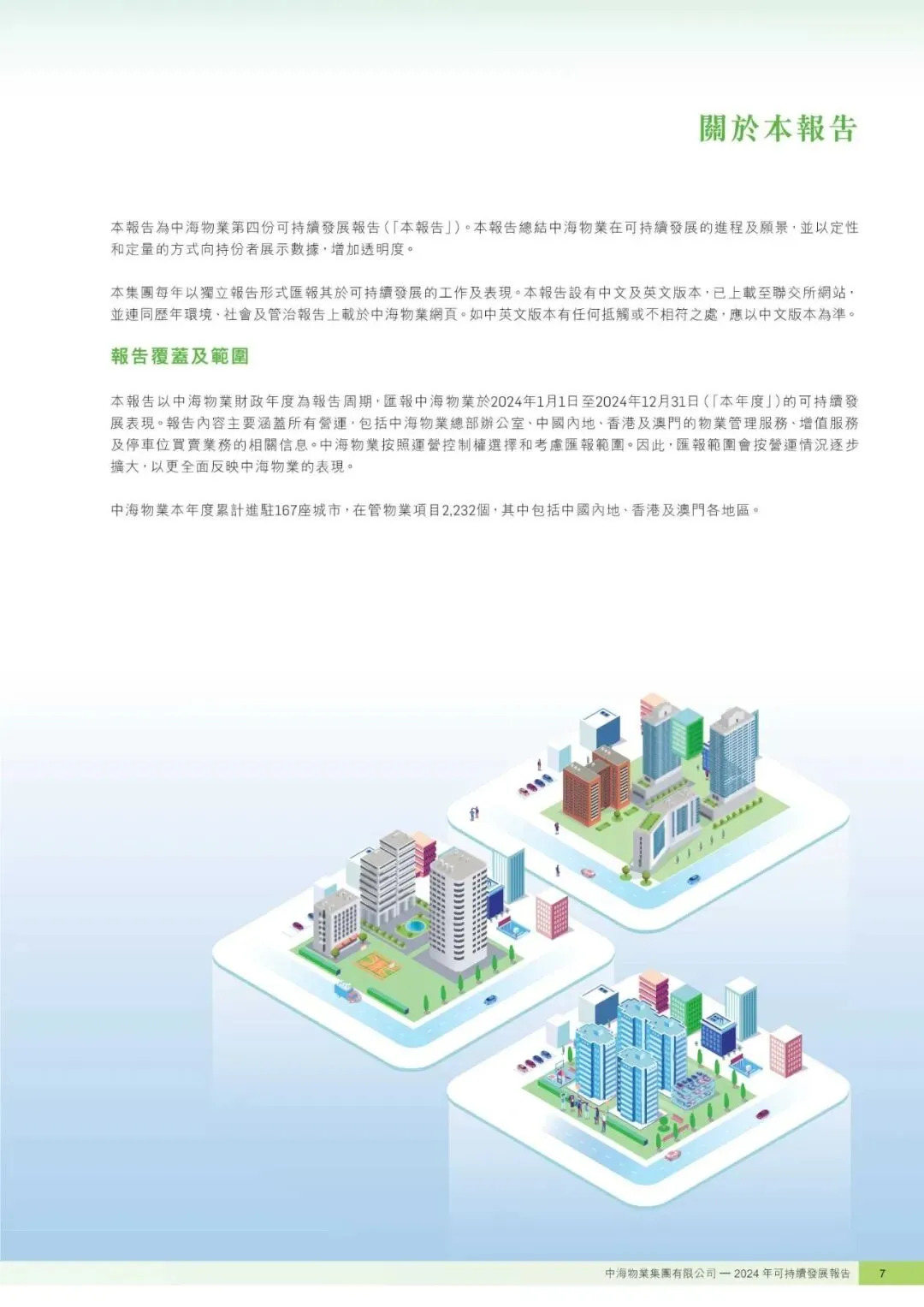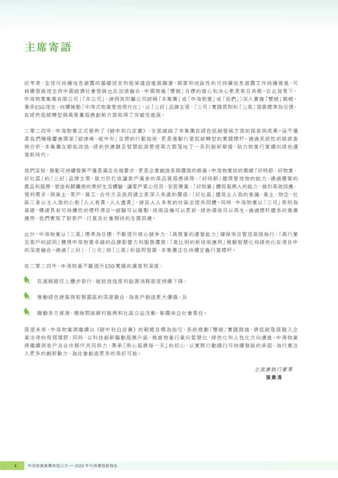 近年來,全球可持續信息披露的基礎語言和框架建設進展顯著,國家和地區性的可持續信息披露工作持續推進,可持續發展理念與中國經濟社會發展也在加速融合,中國推進「雙碳」目標的雄心和決心更是有目共睹。在此背景下,中海物業集團有限公司(「本公司」,連同其附屬公司統稱「本集團」或「中海物業」或「我們」)深入貫徹「雙碳」戰略,秉承ESG理念,持續推動「中海式物業管理現代化」,以「三好」品牌主張、「三可」實踐原則和「三高」發展標準為引領,在綠色低碳轉型與高質量服務創新方面取得了突破性進展。