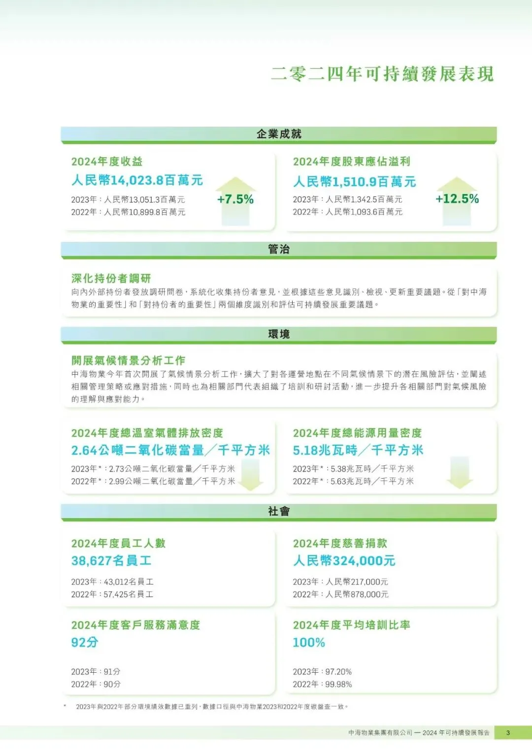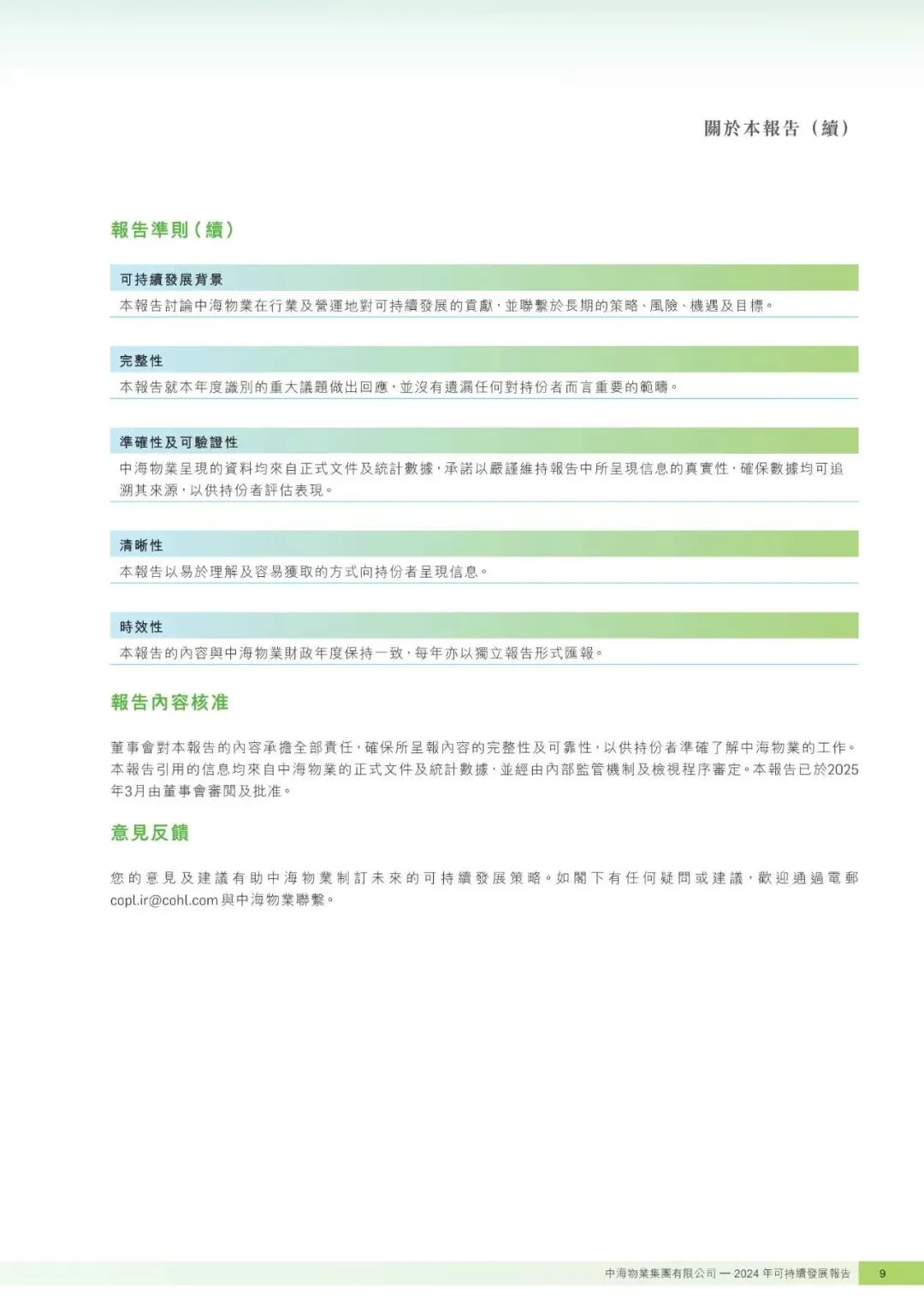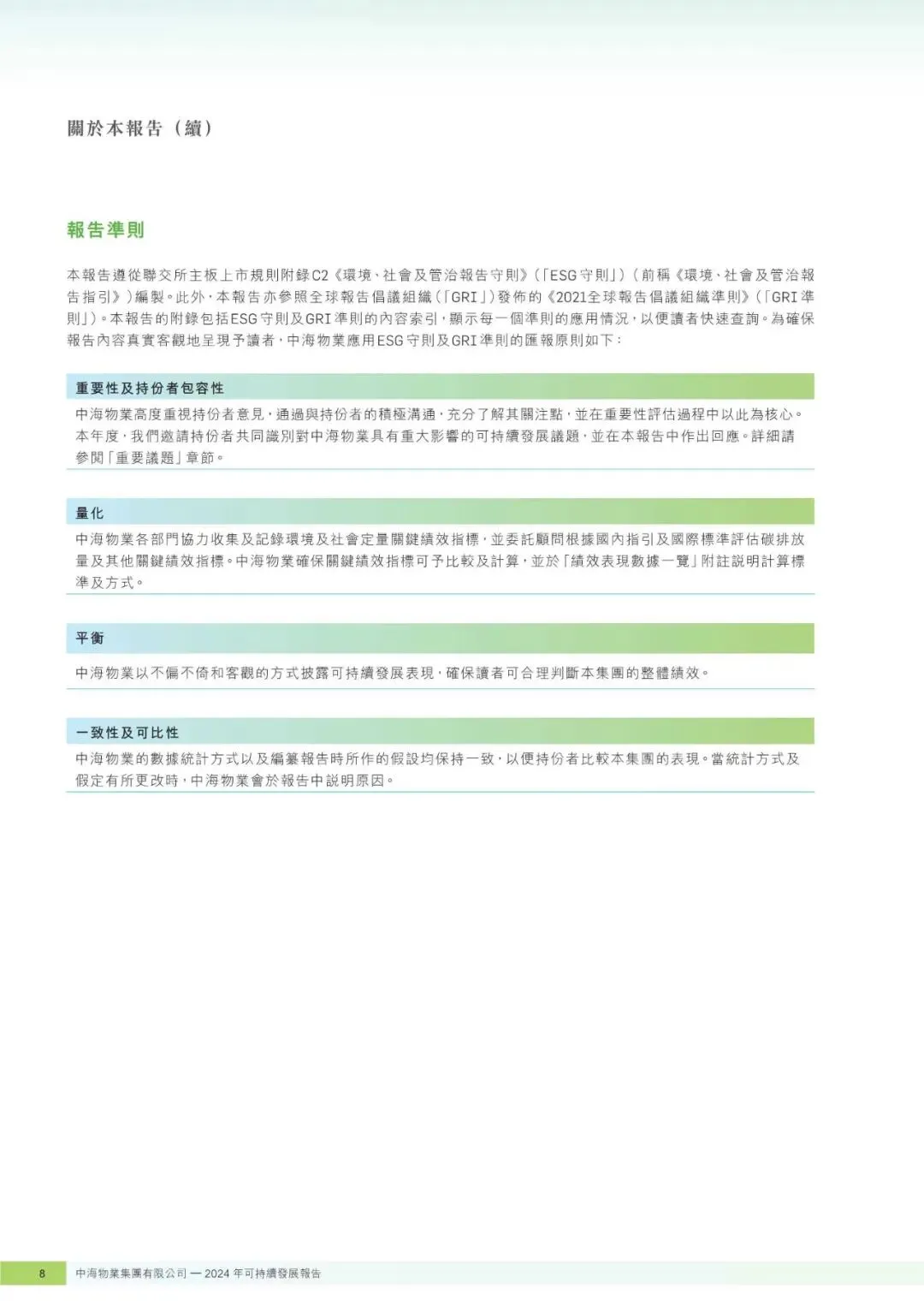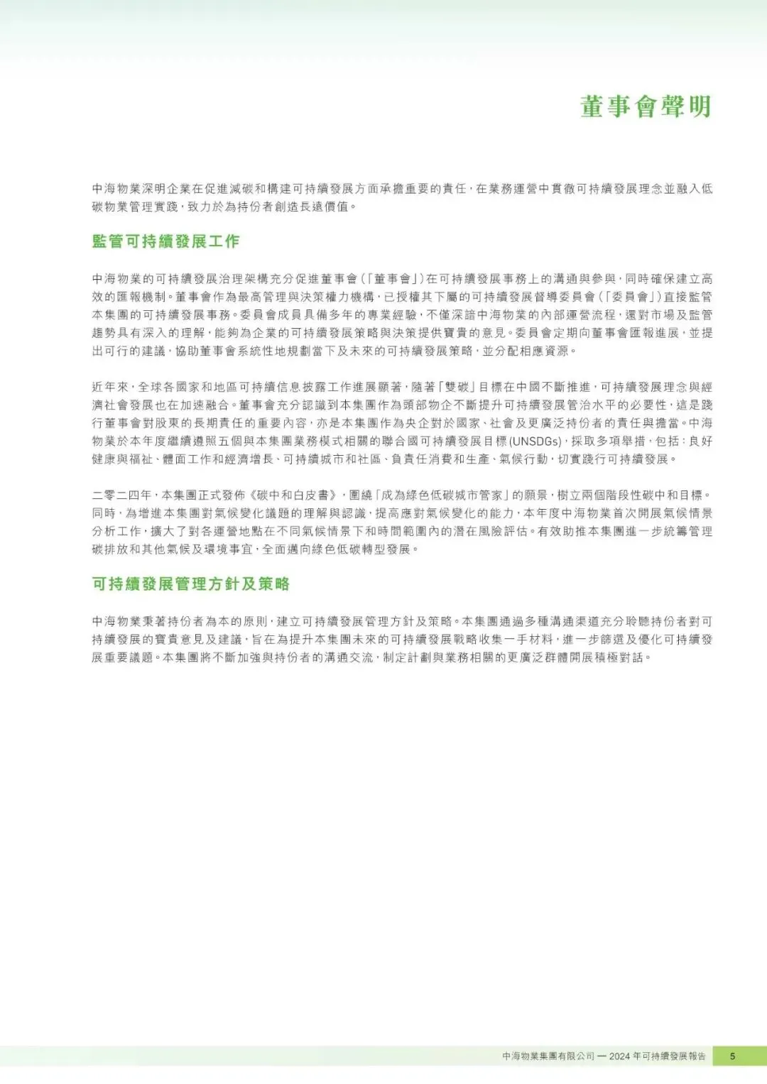 近年來,全球可持續信息披露的基礎語言和框架建設進展顯著,國家和地區性的可持續信息披露工作持續推進,可持續發展理念與中國經濟社會發展也在加速融合,中國推進「雙碳」目標的雄心和決心更是有目共睹。在此背景下,中海物業集團有限公司(「本公司」,連同其附屬公司統稱「本集團」或「中海物業」或「我們」)深入貫徹「雙碳」戰略,秉承ESG理念,持續推動「中海式物業管理現代化」,以「三好」品牌主張、「三可」實踐原則和「三高」發展標準為引領,在綠色低碳轉型與高質量服務創新方面取得了突破性進展。