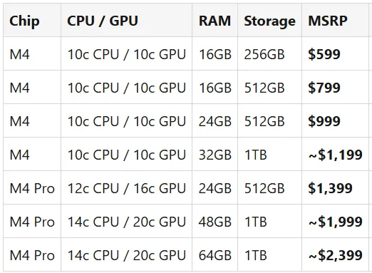 新款Mac Mini 价格(所有M4 配置)