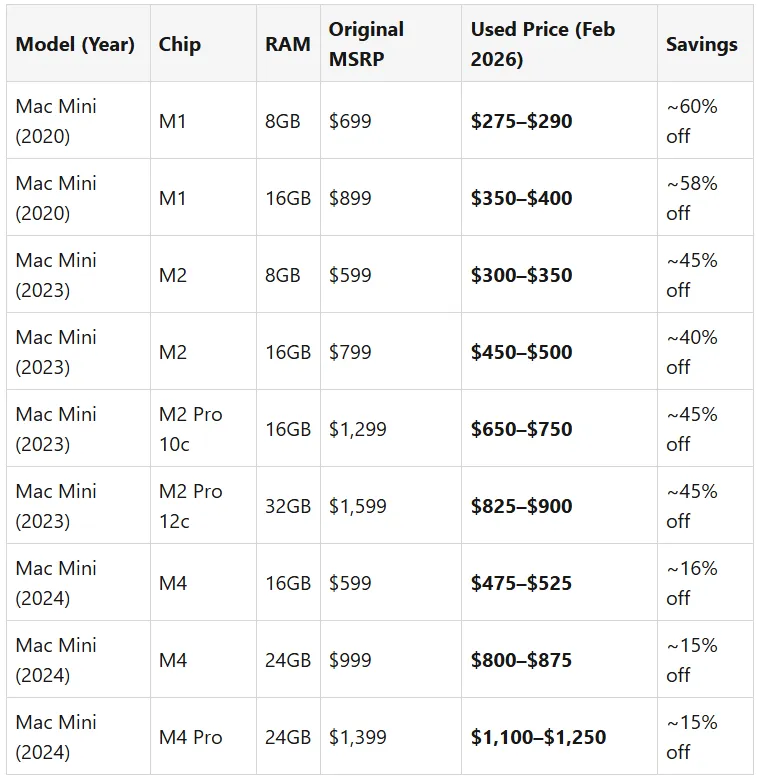 价格降幅最大的是M1 和 M2 型号——您能以原价的 45%至 60%的价格购买到这些产品。M4 型号的价格尚未大幅下降,因为它们才生产了不到两年的时间。
