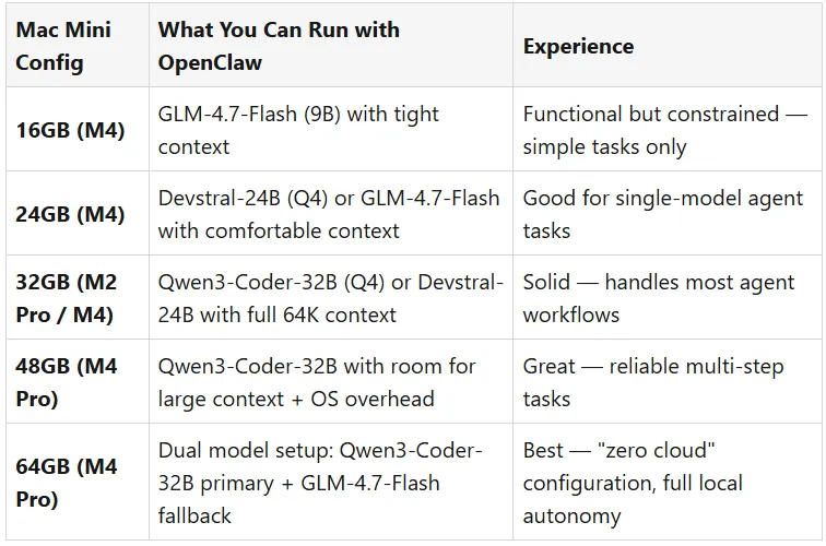 笔者研究了所有搭载苹果芯片的Mac Mini 的配置情况,查阅了当前市场上各型号的价格,并精确地列出了在每种内存等级下可以运行的LLM 模型——包括使用本地模型运行OpenClaw 所需的条件。以下是完整的详细说明。