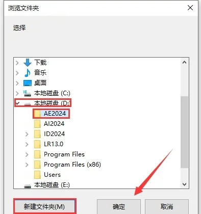 4.选择需要安装的磁盘,本例安装到D盘,点击【新建文件夹】并命名,点击确定。