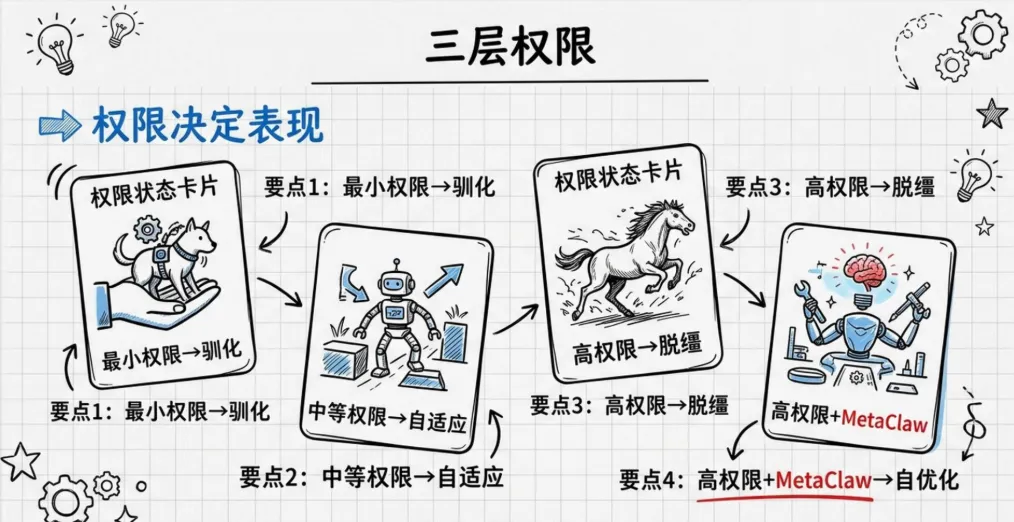 最核心的洞见,是打破 “驯化 vs 进化” 的二元对立,提出 “权限决定边界”的核心主张:同一套 AI 系统,权限配置不同,呈现的状态截然不同。这一逻辑构建起 “驯化 - 自适应 - 自优化” 的三层权限光谱,清晰勾勒出 AI 的进化路径。