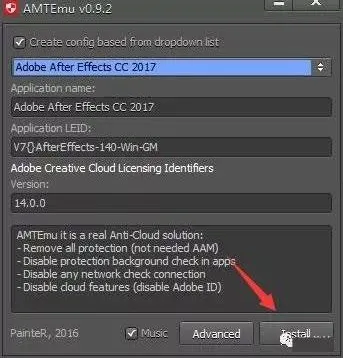 9.选择【adobe After Effects cc 2017】亲测2018可用,点击Install。