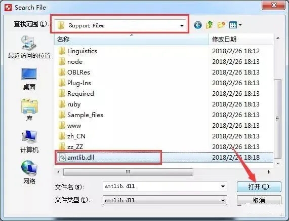 在【查找范围处】选择【C:\Program Files\Adobe\Adobe After Effects CC 2018\Support Files】目录下的amtlib.dll ,点击打开。
