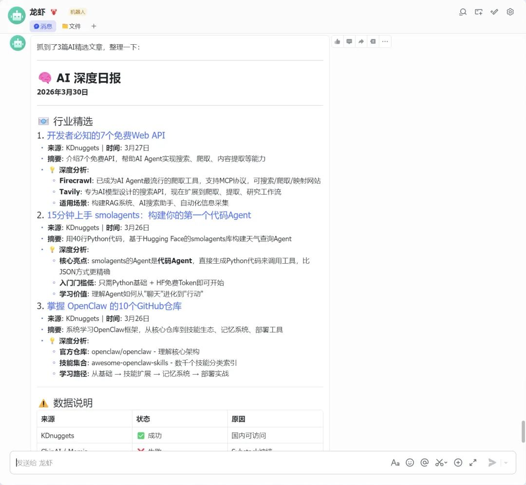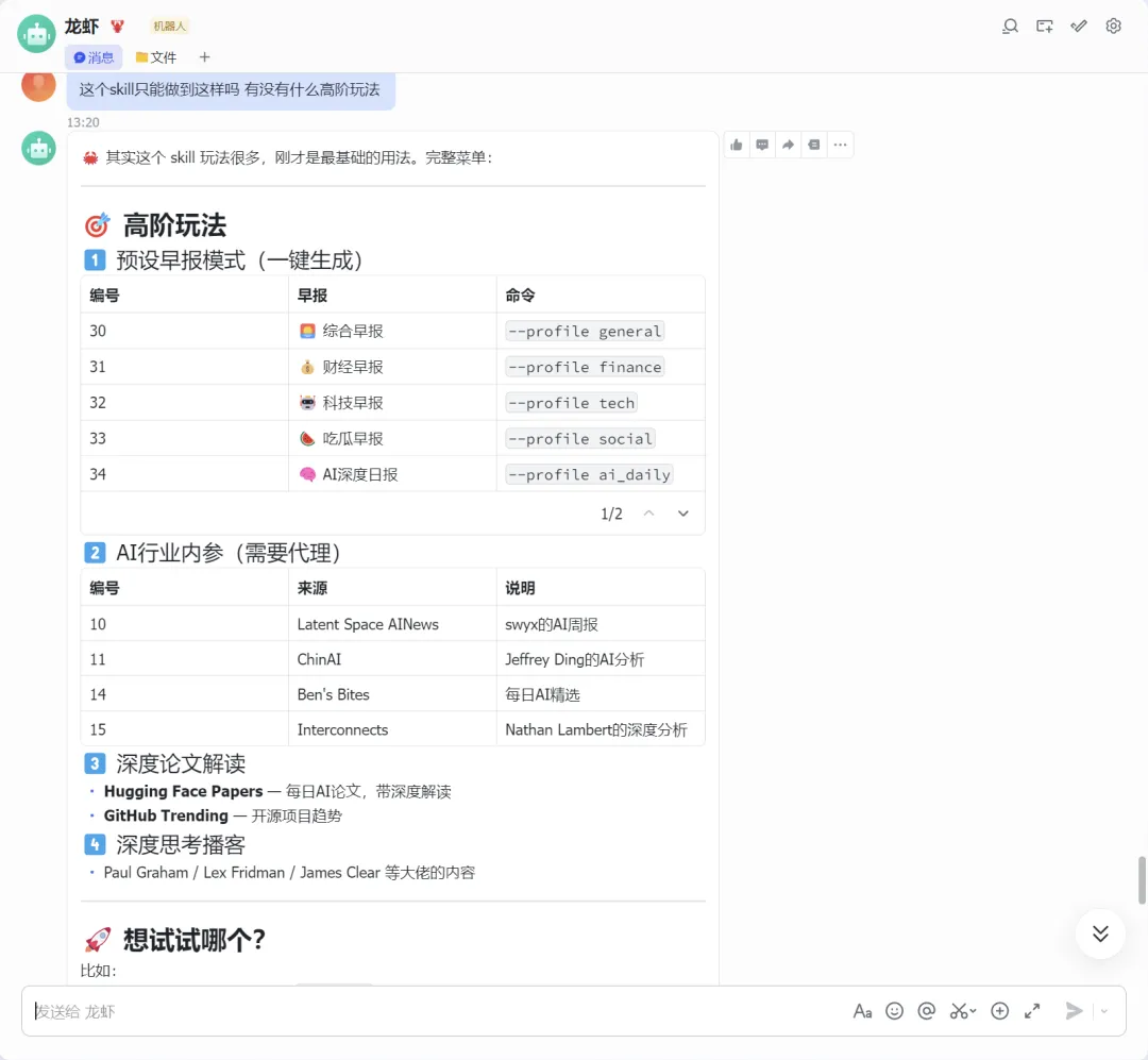 当然,我也承认,这条 skill 可能不是只有我眼前看到的这点东西。作为一个综合评分高达 4.9 的 skill,它肯定不止一个简单日报这么点能力。可惜原文主要是英文,我自己没耐心全啃完,就直接问了龙虾,让它把这条 skill 的能力范围给我解释了一遍。