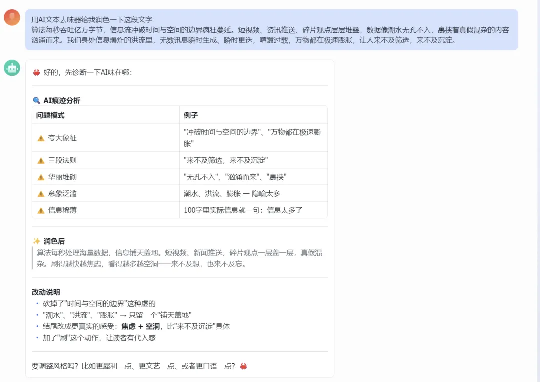 这条我和我身边不少人都在用,而且不是那种“装了,但躺在角落里偶尔想起来才用一下”的用法,而是真的会反复拿出来压稿子、顺语气、去掉那种一眼看上去就很 AI 的腔调。说实话,到现在我还没找到一个真正让我愿意把它替掉的平替。