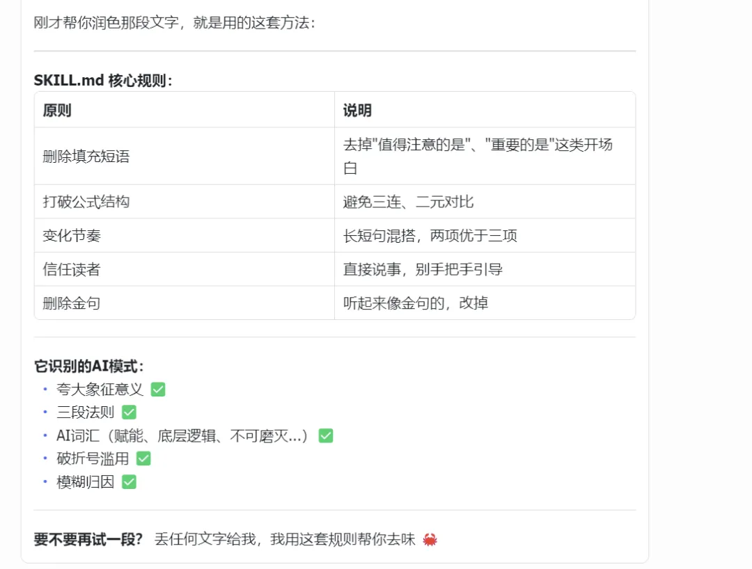 我知道这种对比图不算特别严谨,毕竟“去味”这件事本来就不像跑 benchmark 那么容易量化。但有些 skill 你其实不用把它讲得特别复杂,反复用过之后,你会形成一种很稳定的直觉:它有没有被我真的留下来。 这条就是。