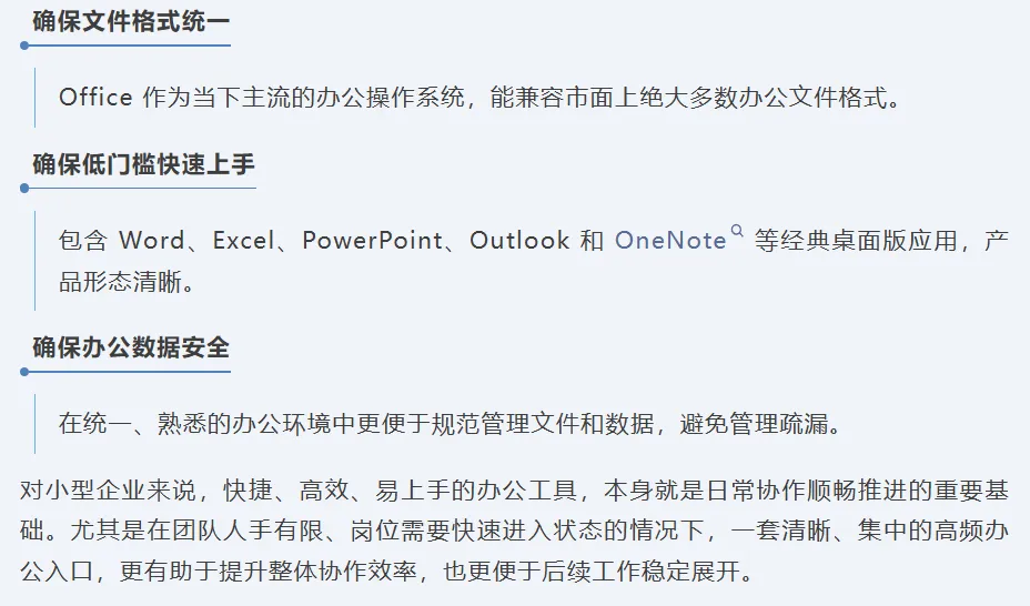 Word、Excel、PowerPoint、Outlook 和 OneNote 这一组应用,覆盖了写材料、处理数据、做汇报、收发邮件和记录信息等常见工作内容,对小团队来说,这种配置能够极大程度满足日常工作所需,无需在不同系统之间切换。