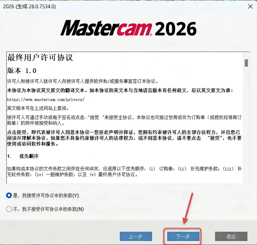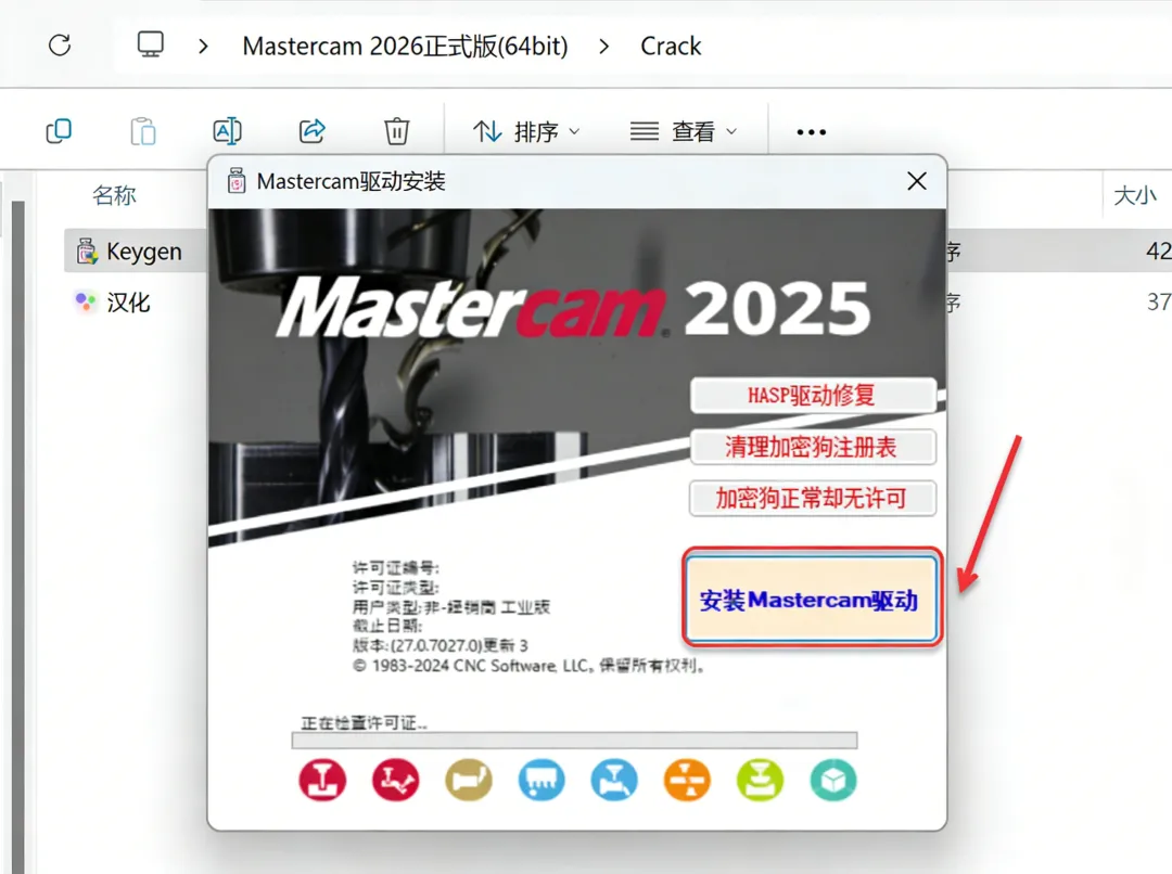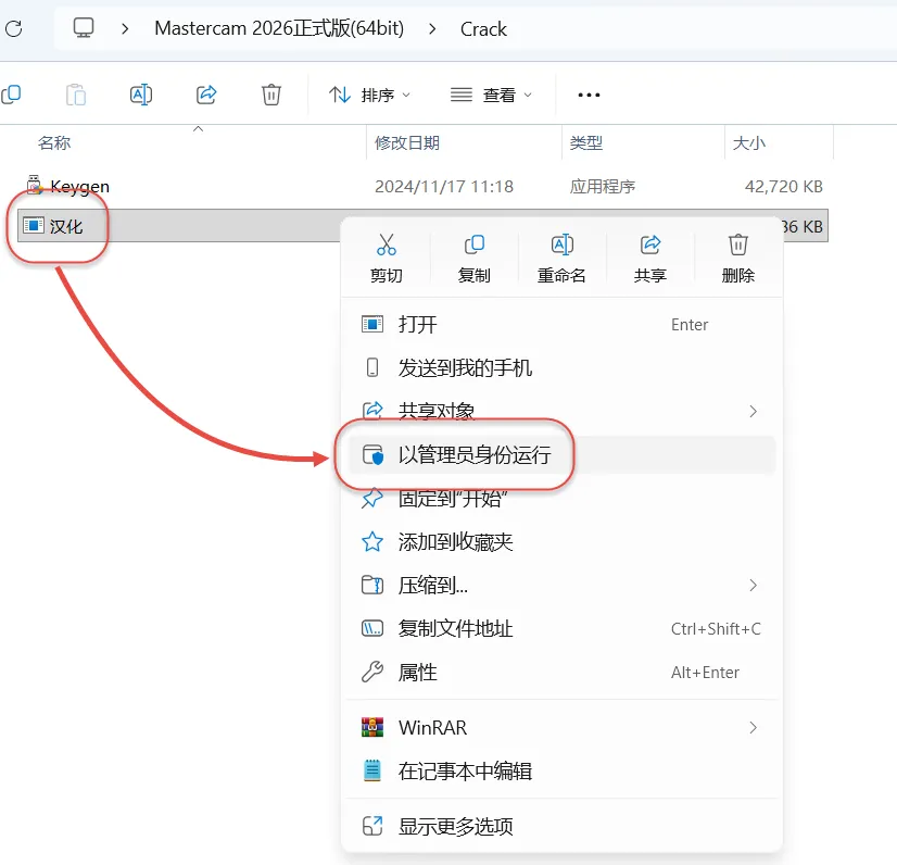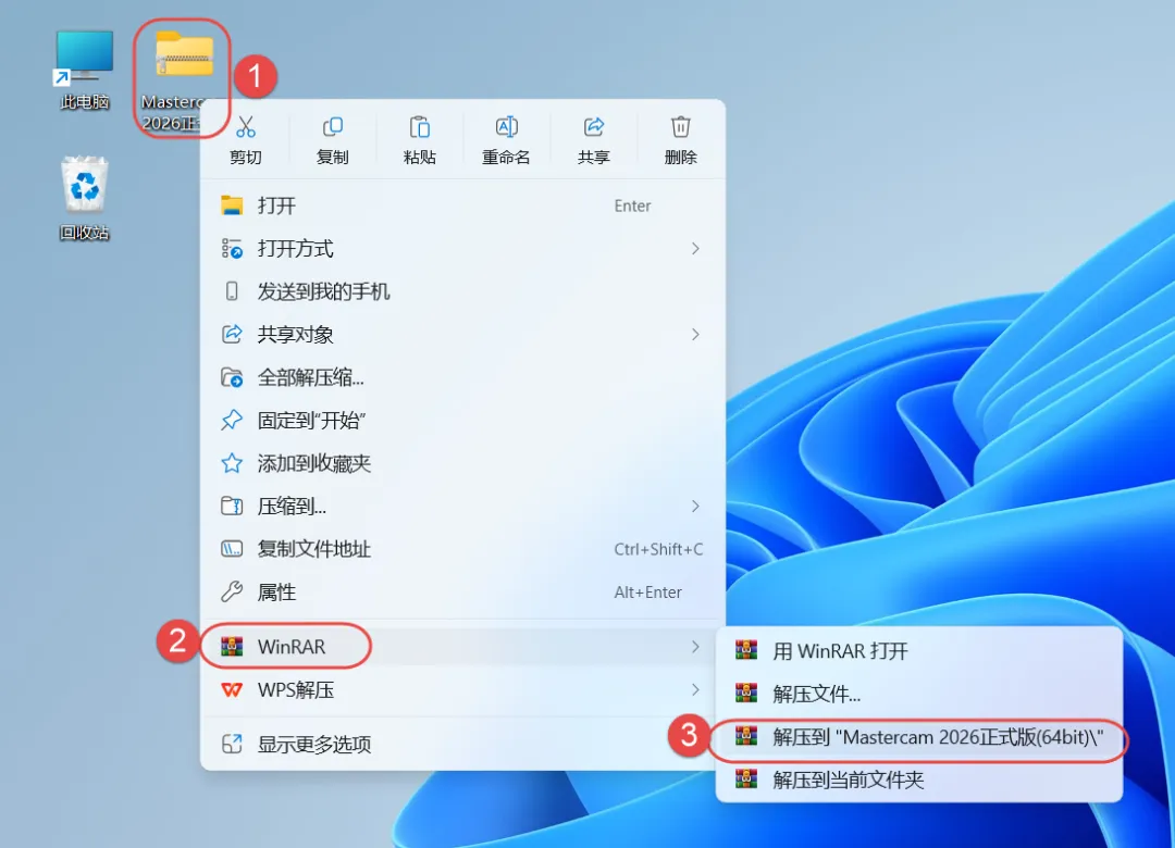 1.解压安装包:①鼠标右击【Mastercam 2026正式版(64bit)】压缩包②选择电脑上安装的解压软件(如:winrar压缩)③点击【解压到 Mastercam 2026正式版(64bit)】。