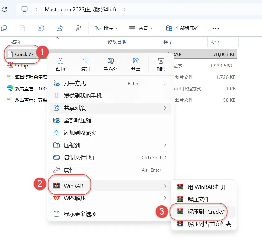 11.打开解压后的【Mastercam 2026正式版(64bit)】文件夹①鼠标右击【Crack】压缩包②选择电脑上安装的解压软件(如:360压缩)③点击【解压到Crack】。