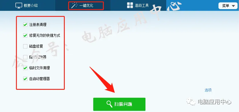 5.1、一键优化,可根据自己的需求勾选需要扫描项目,进行扫描。