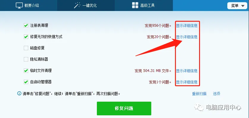 点击扫描问题后,等待软件扫描完成,我们就可以点击右侧的显示详细信息查看扫描详细问题内容了。