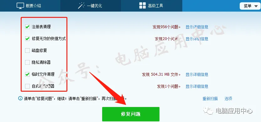 然后勾选需要优化项目,点击修复问题即可进行修复问题操作。