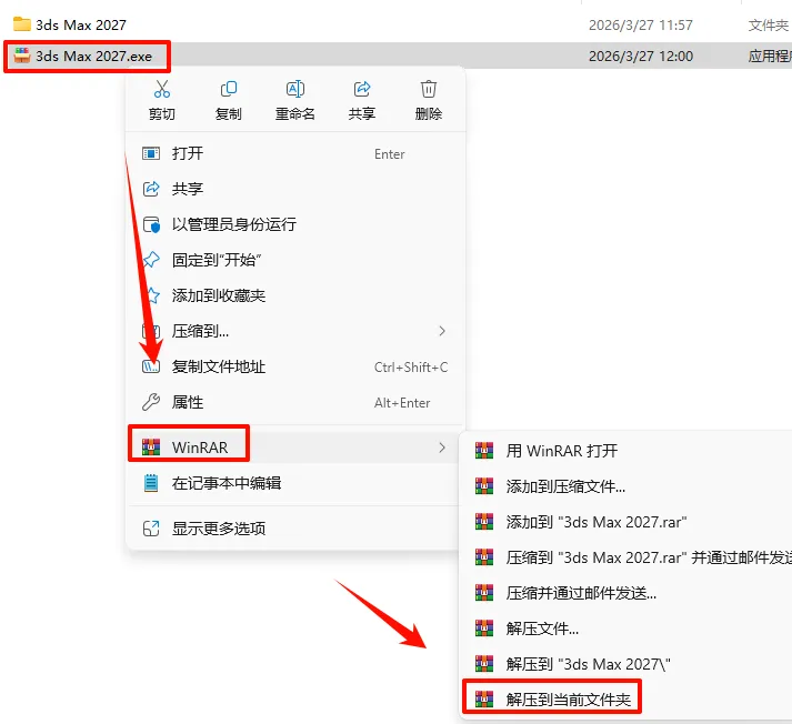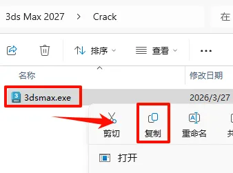 8.返回之前解压的“3ds Max 2027”文件夹,双击打开“Crack”文件夹,选中“3dsmax.exe”文件,鼠标右键点击“复制”