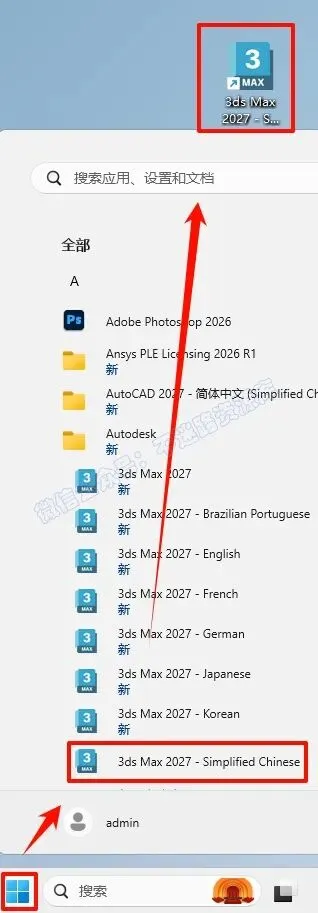 12.点击“开始“菜单栏,找到“3ds Max 2026 - Simplified Chinese“软件,鼠标左键拖拽到桌面上即可创建桌面快捷方式