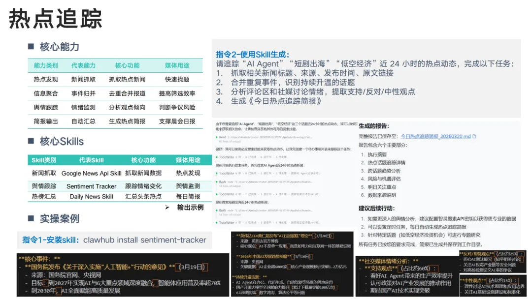 一个典型案例是热点追踪。报告演示了如何让OpenClaw追踪“AI Agent”“短剧出海”“低空经济”三个话题近24小时的动态:抓取新闻标题与链接,归并重复事件,识别持续升温话题,分析评论区与社媒情绪,最终生成一份《今日热点追踪简报》。