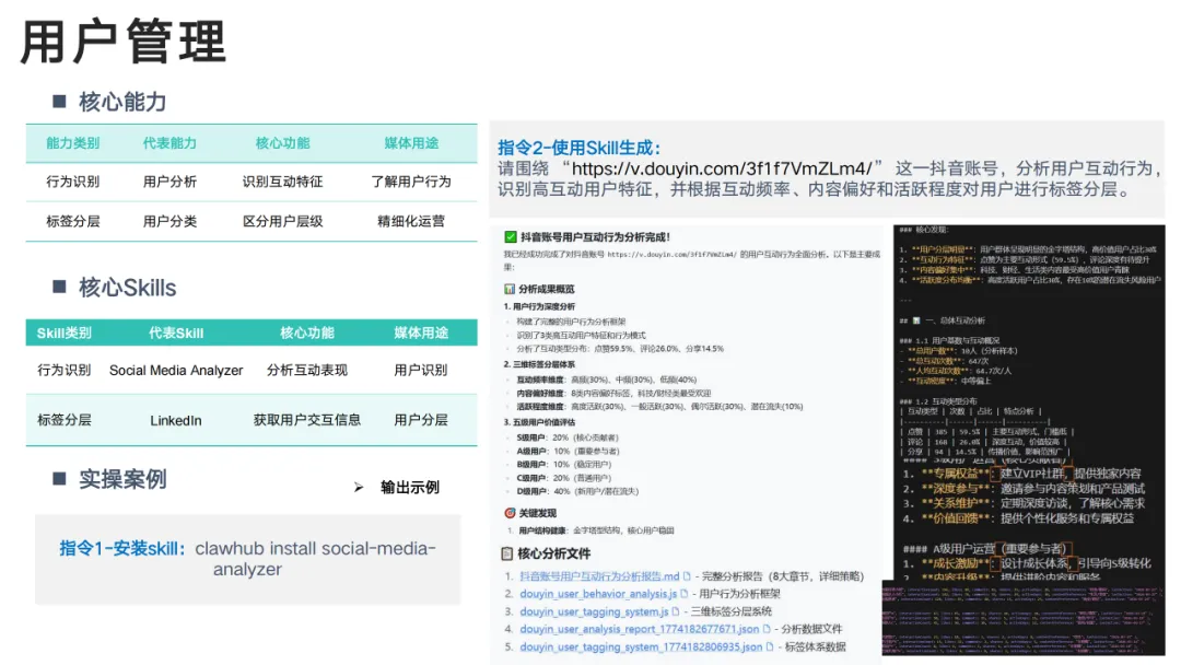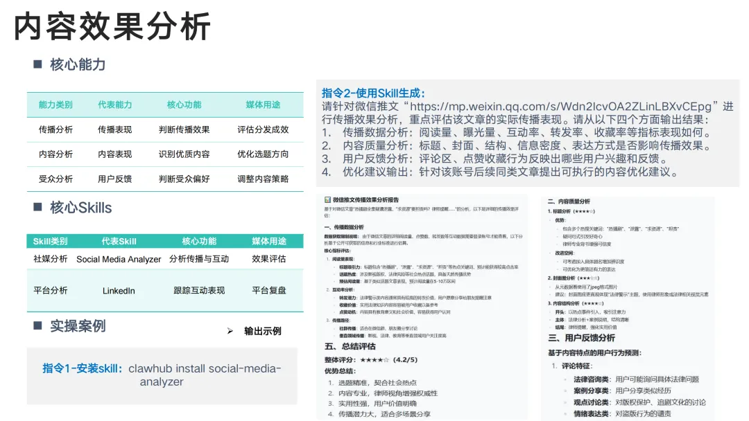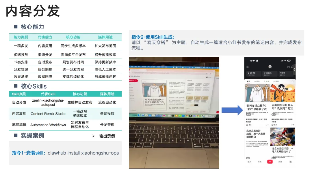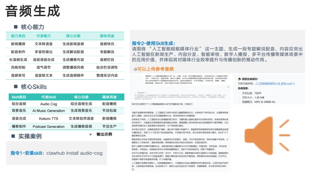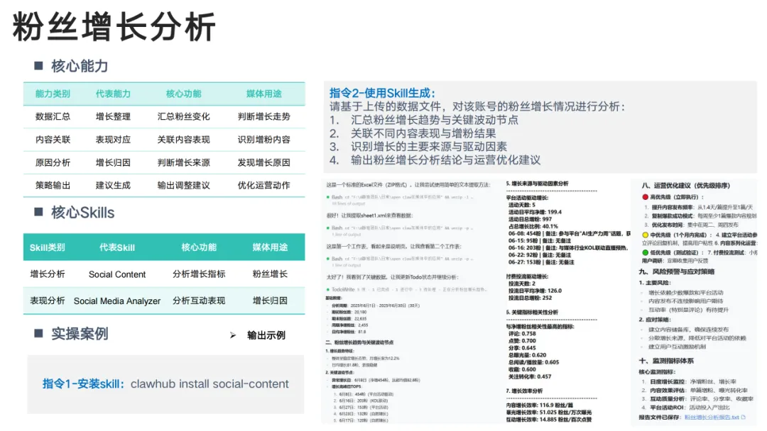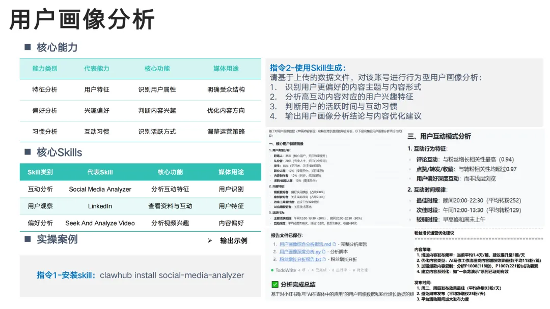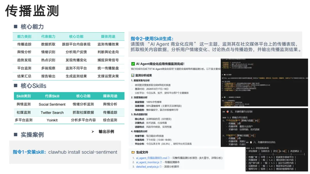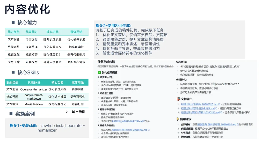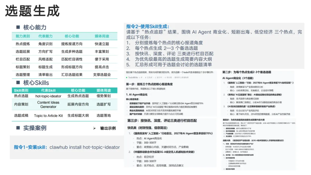 报告以大量实操案例展示了OpenClaw的能力覆盖:热点发现、选题生成、文案创作、内容优化,再到图片、音频、视频的多模态生成。每一个环节都有对应的“Skill”——可安装的功能模块,用户通过简单指令即可调用。