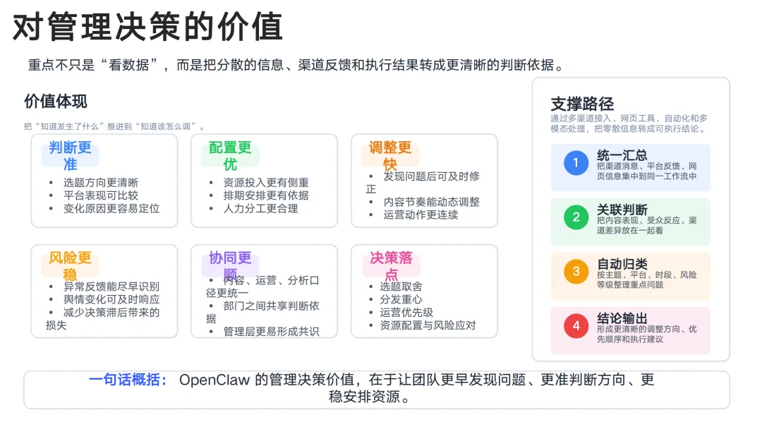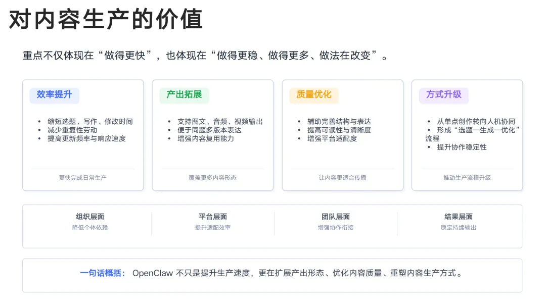 核心判断: OpenClaw的价值“不只在于生成内容”,更在于将选题、生产、分发、分析各环节连接成完整链条。AI在媒体领域的角色,正在从“辅助写作”走向“流程重构”。