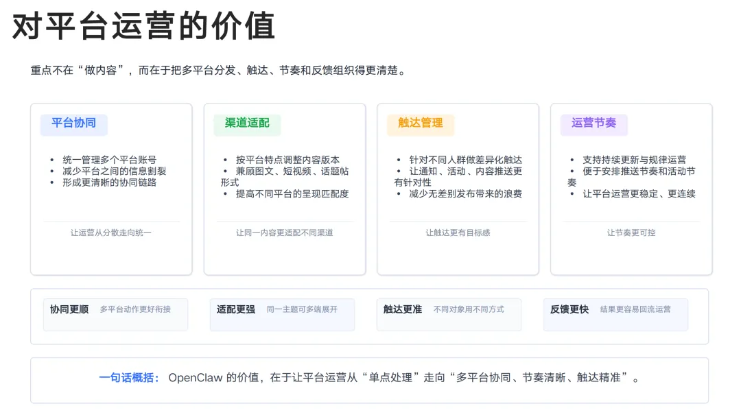 对平台运营而言,重点不在于“做内容”,而在于把多平台分发、触达节奏和用户反馈组织得更清楚。过去,一个内容团队可能要同时管理五六个平台,手动适配、手动发布;现在,这些流程可以统一编排、统一执行。