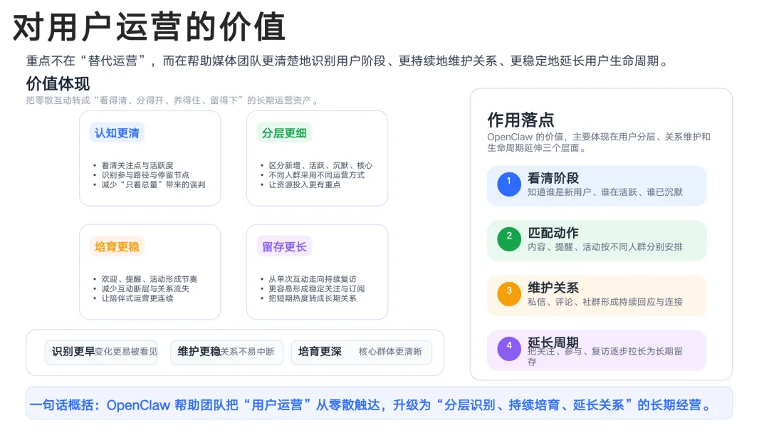 对用户运营而言,价值在于帮助媒体团队更清楚地识别用户阶段、更持续地维护关系、更稳定地延长用户生命周期。从分层识别到互动执行,再到长期留存——这套逻辑让用户运营从零散触达升级为系统经营。