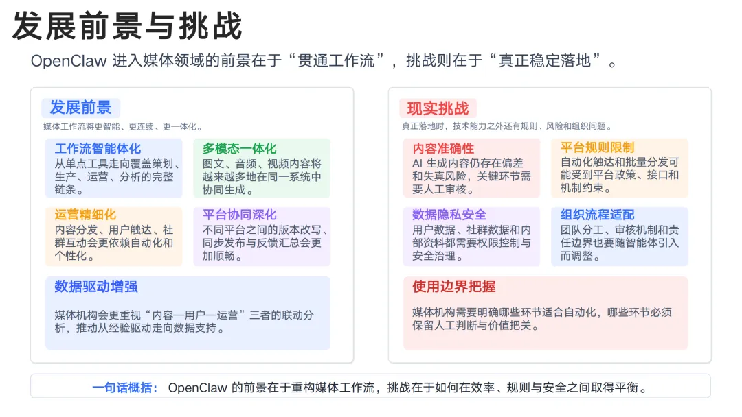 报告最后一句话概括了这种张力:“OpenClaw的前景在于重构媒体工作流,挑战在于如何在效率、规则与安全之间取得平衡。”