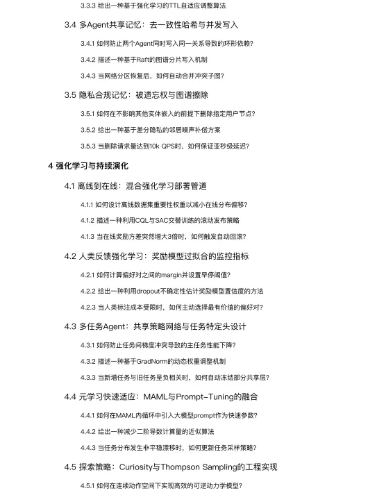 强化学习与持续演化:详细阐述了如何用强化学习训练和优化Agent,涵盖从离线训练到在线部署的管道、人类反馈强化学习、多任务学习、元学习快速适应以及高效的探索策略。