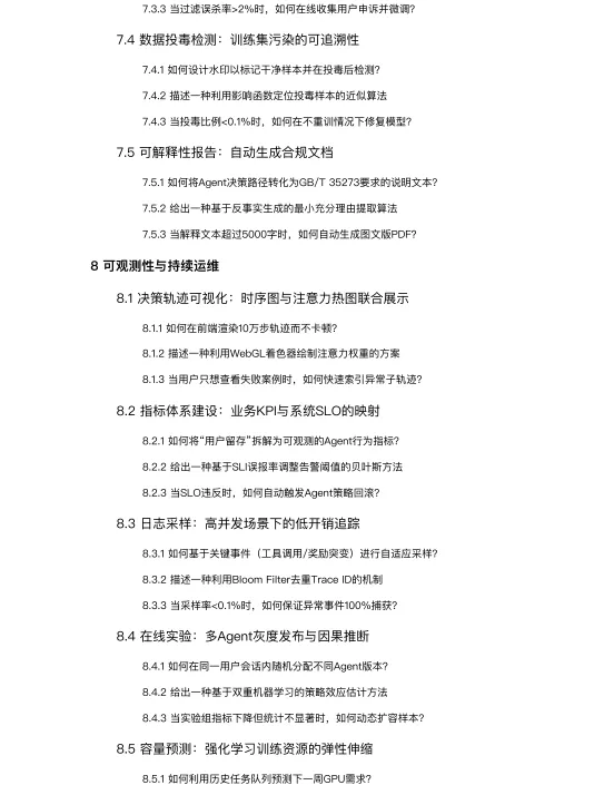 可观测性与持续运维:讲述如何监控和运维一个生产环境的Agent系统,包括决策轨迹可视化、指标体系构建、日志采样、在线实验(A/B测试)和资源容量预测。