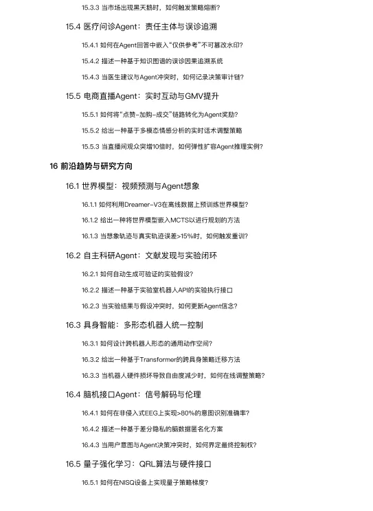 前沿趋势与研究方向:展望了Agent技术的未来发展方向,包括世界模型、自主科研Agent、具身智能、脑机接口和量子强化学习等前沿领域。