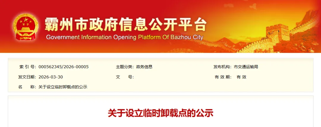 为严厉打击域内及途径霸州区域超限超载违法运输行为,合理布局我市车辆超限超载治理点位,严格规范治超检查和处罚行为,按照《超限运输车辆行驶公路管理规定》(交通运输部令2021年第12号令)和《交通运输部、公安部关于治理车辆超限超载联合执法常态化制度化工作的实施意见(试行)》(交公路发[2017]173号)要求,距离超限检测站较远的,就近引导至具有停放车辆和卸载条件的超限检测点接受检查处罚。现在霸州市G105线K100+980左侧设立临时卸载点一处:霸州市堂二里镇隆龙商砼院内,公示期为2026年3月30日。