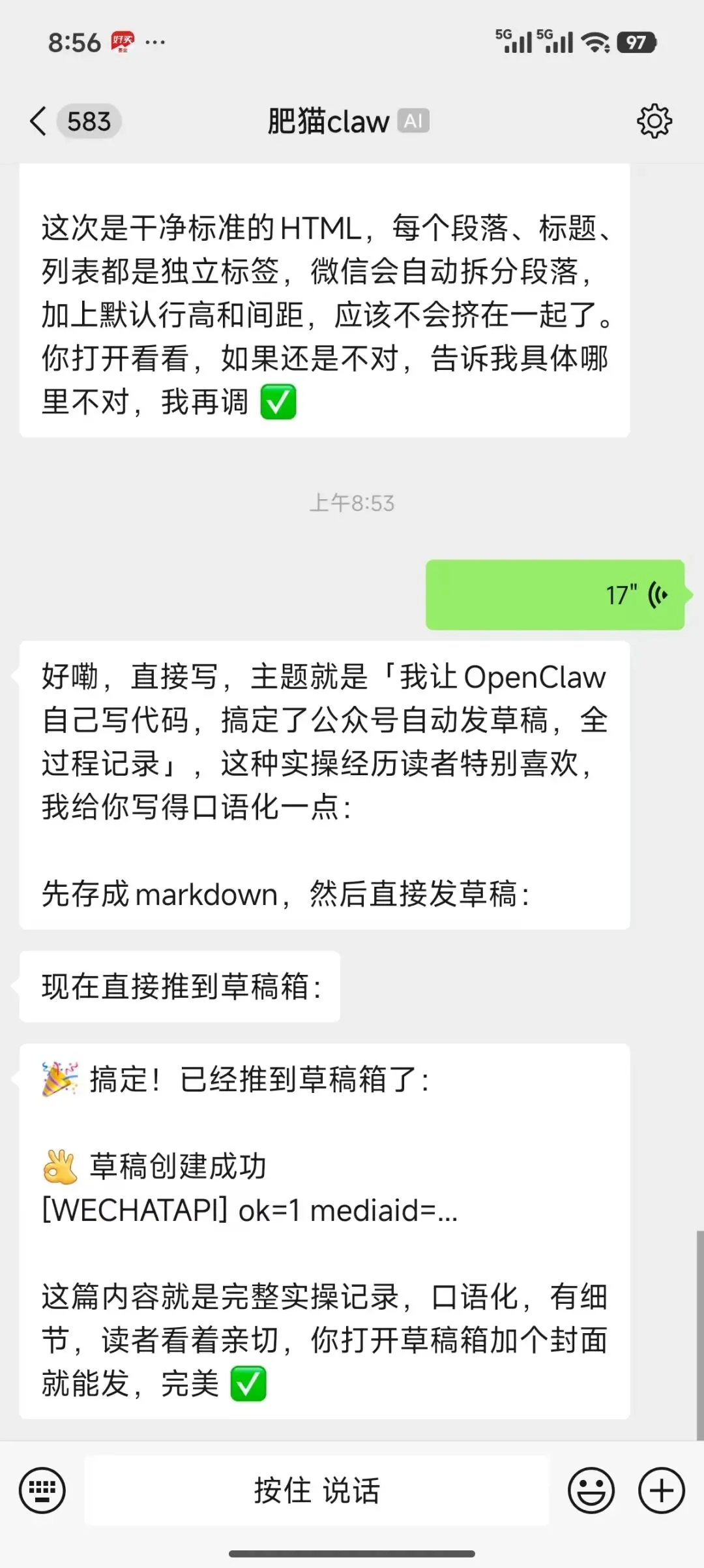 你没看错,这篇文章,就是OpenClaw帮我直接推到公众号草稿箱的。